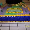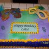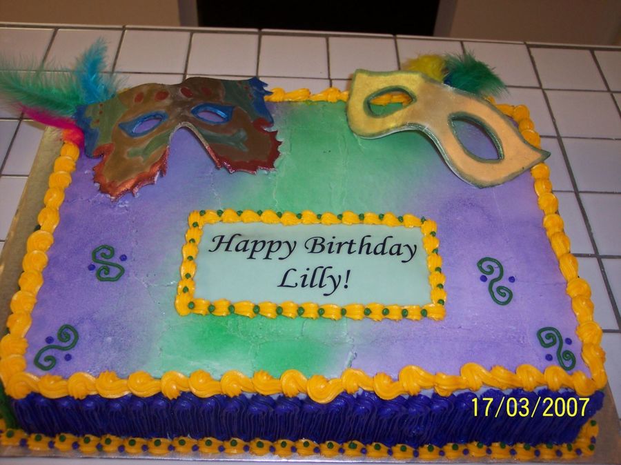 This was a chocolate cake iced w/ BC for a six year old girls birthday party. The masks were made with fondant and painted w/ luster dust.