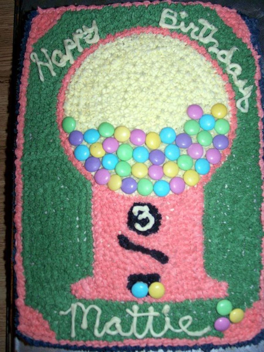 THis Bubble gum machine is an easy to personalize cake. You can choose Cost of gumballs by age of person, and I used the colors from the cake plates and streamers as my base colors.