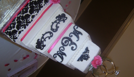 Buttercream cake with fondant trim and bow with glam ribbon touches.