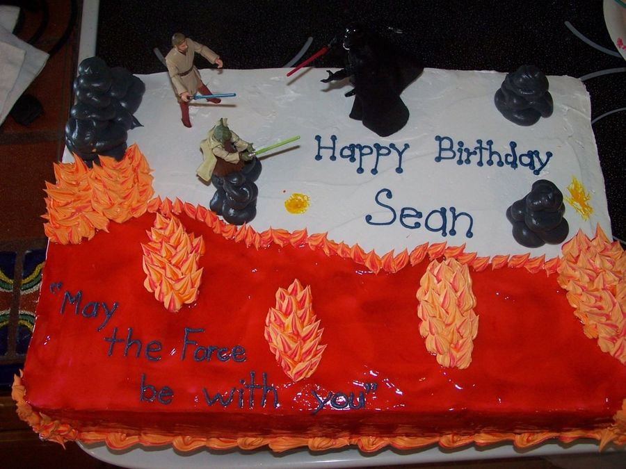 This was a full sheet cake covered in whipped cream icing (Wilton brand, which holds its shape very well). I made the lava with red piping gel and made a flame border with #18 star tip, I did striped icing with orange, red & yellow in the same bag to achieve the flame colors. The figurines were from the toy isle at Target, that way the keepsake becomes a toy.