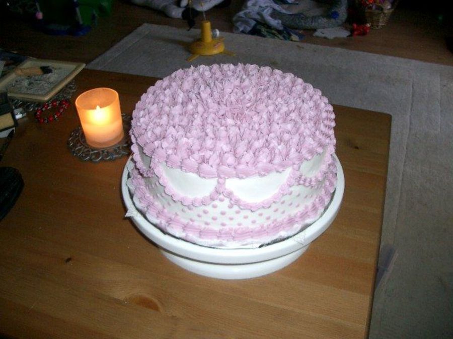 A family member of the friend that I gave my re-done course one cake to loved it so much, that he wanted me to make one for him. So, I did this and decided to practice shell swags and swill dots. Originaly on the top I had done a few swirl drop flowers with the 2D tip, but I messed one up. So, instead of taking it off and redoing it (this is just a practice cake after all) I decided to just fill in the top with 2D stars. I love the texture effect this gave me, and I am sure I will do it again in the future.