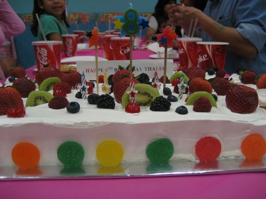 This cake was make for my little cousin. It was white cake with 1/2 strawberry and 1/2 lime jello inside coolwhip frosting and the cupcakes where white cake with lemon jello.