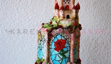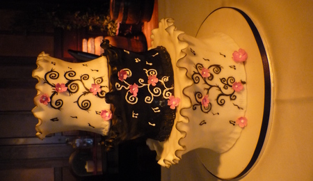 This cake was painted red metallic, with royal icing lace flowers and hand painted black lace.