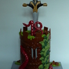 A dungeon tower for Jeremie, 18 years old who loves dungeons and dragons. All chocolate cake with chocolate ganache covered with fondant. All decorations, sword, leaves, dragon tail and 18 are fondant.