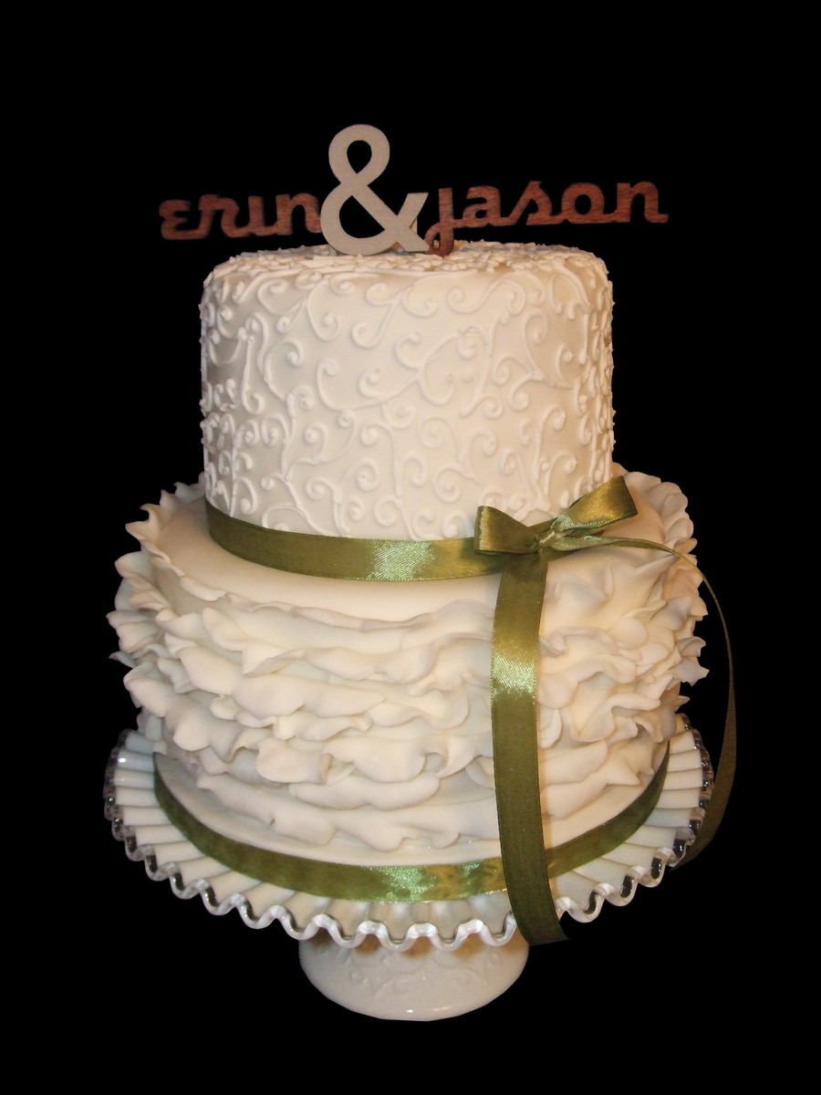 8 and 6 inch cakes fondant covered in ruffles and royal icing piping. She also had a huge layered sheet cake for extra servings.