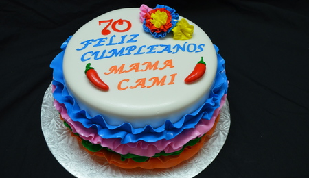 This cake was made for a photoshoot. The inspiration board had vintage blue and white china in a few of the inspiration pictures. I hand painted the blue floral design on the middle tier. The ruffles and beads are all fondant. The flowers on top are fresh flowers.