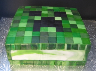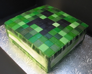 Dark chocolate cake, bubblegum flavored filling (made by adding a packet of tropical Kool ade to buttercream). The cake was then covered with marshmallow fondant over which I applied the one hundred one inch squares made of a mix of fondant and candy clay made with Wilton candy melts. I used Wicked Goodies modeling chocolate recipe (in her wonderful book) to make the candy clay and it turned out perfect. I slightly blended the scraps to make the squares for trimming the sides.