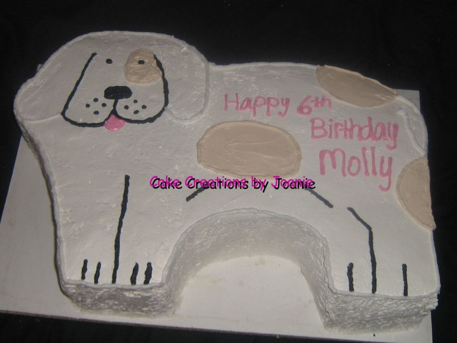 Customer wanted a puppy carved from a 2 layer filled sheet cake. Frosted in nondairy whipped frosting with nondairy whipped frosting details.