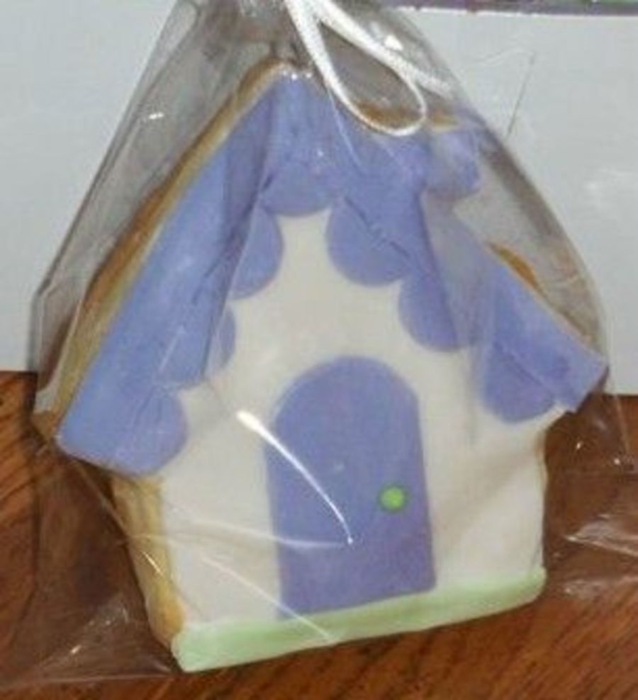 I tried to make this look like the little house logo on my website. It's all fondant except for the RI door handle. I tied my box with a purple ribbon and added this to it. My customer picked up the cookies the day before the party for which she ordered the cookies, and said she ate the house cookie as soon as she got them home! That was why I put it there, as a little bonus for the customer, and I got bonus points for presentation!