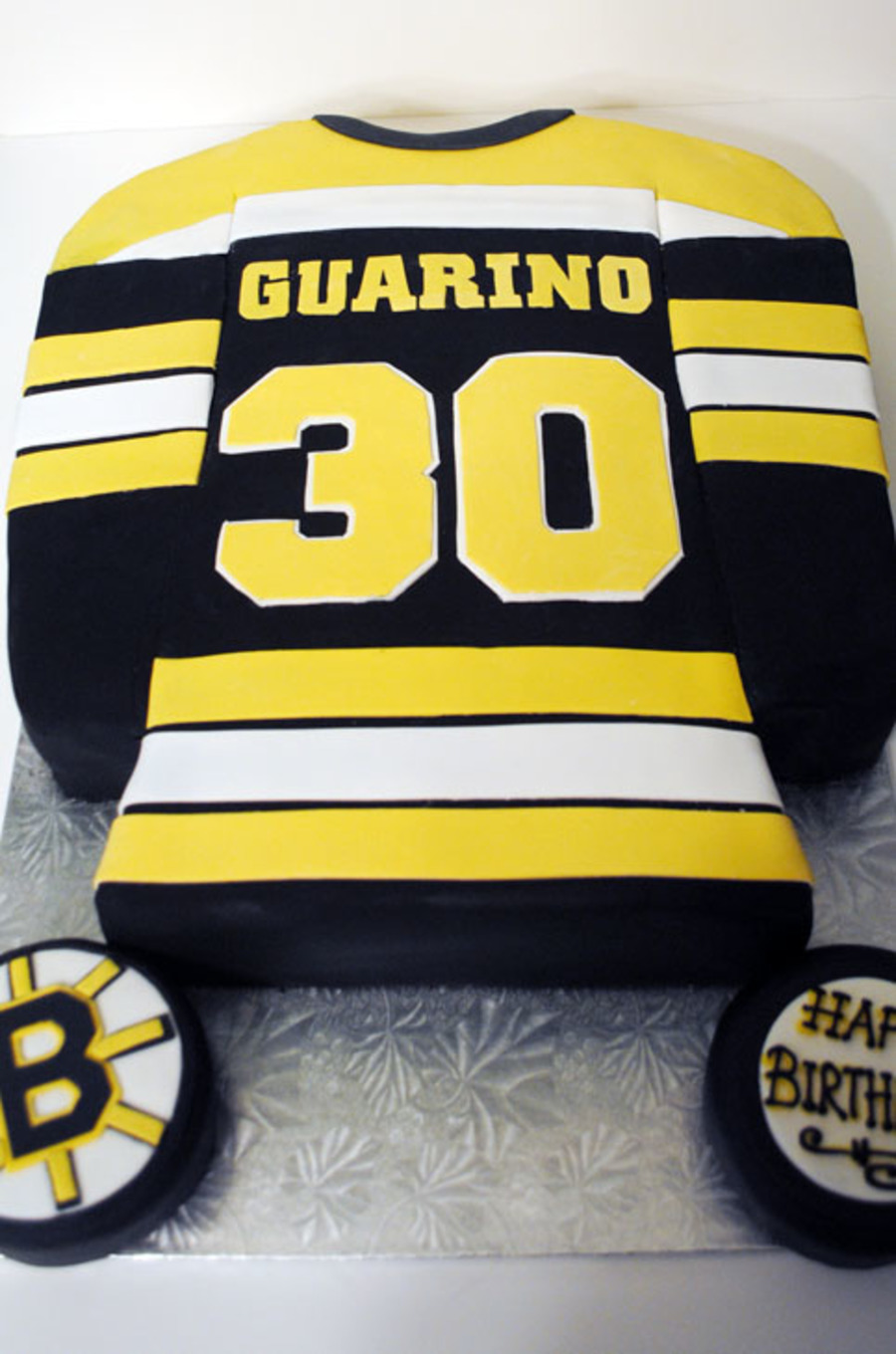 Bruins cake for a 30th birthday, Cake carved into shirt shape and covered in fondant. All hand cut letters and number 30. LOVED this Cake! <3