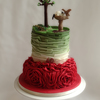 A Ruby Wedding Anniversary cake. The little cat is called Cass (in real life). And the bird bath is one of her favourite places to hang out apparently :). The cakes are Lemon (bottom tier) and coconut (top tier). The ruffles are sugarpaste (fondant). The figures/tree are modelling chocolate and the garden piped royal icing.
