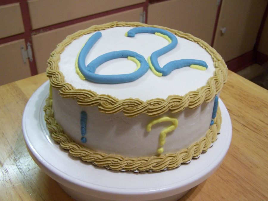 had a call and needed a quick cake for a lady. that is what she wanted on the cake was the guys age 62 with a ? and a ! on it. she didnt care what colors. i love customers like that. the white icing was made using splenda, and the borders and writing are regular icing. the splenda i used my blender and powdered it. it works but not all that great. it still has a little bit of grit to it but with the cake it cuts back the grit a little bit. her husband is borderline diabetic.