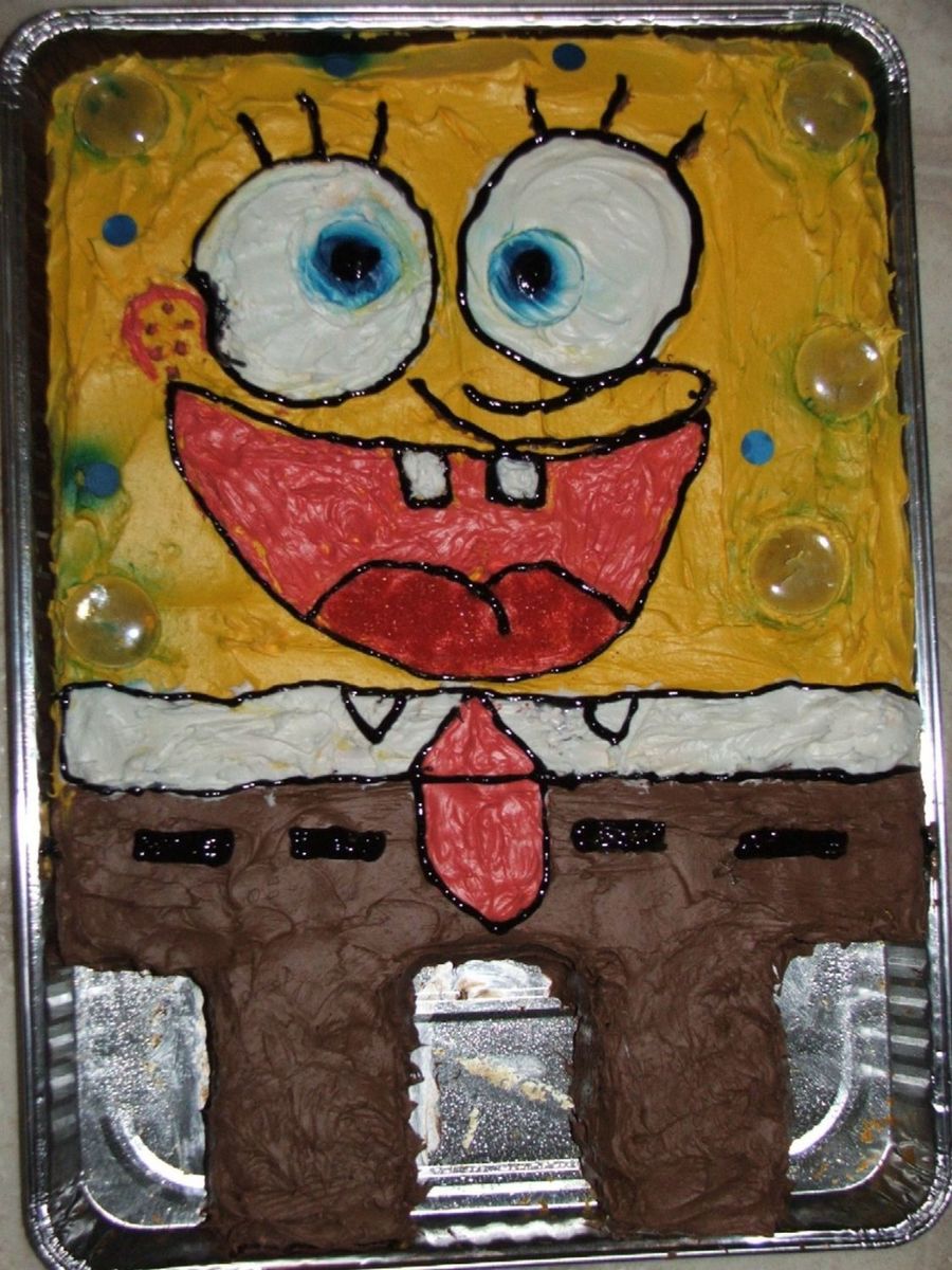First Spongebob Cake I made. Hands and feet are missing but I made them out of colored paper. Bubbles are glass rocks