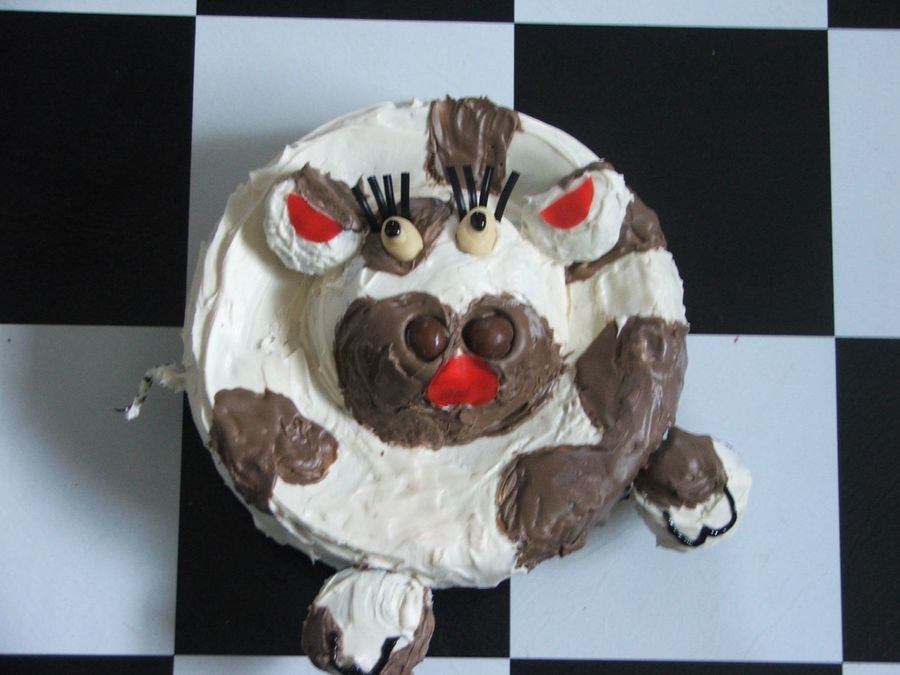 base made out of round cake pan then flipped upside down right away on plate (to give it a sunkin effect. Head small (4 inch) bunt pan. legs made from cup cake. ears and tongue are fruit rollups, nose milk duds,eye lashes made out of twisty ties, but can use black licorish(sp) and eyes pudding bites