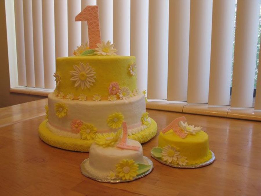 I made this for my twin niece's first birthday. It's french vanilla with raspberry cream cheese filling. The flowers are all gumpaste and it's iced with buttercream. Their little smash cakes have the initials of their first names (Tenille and Lacey). It was a lot of fun to make!