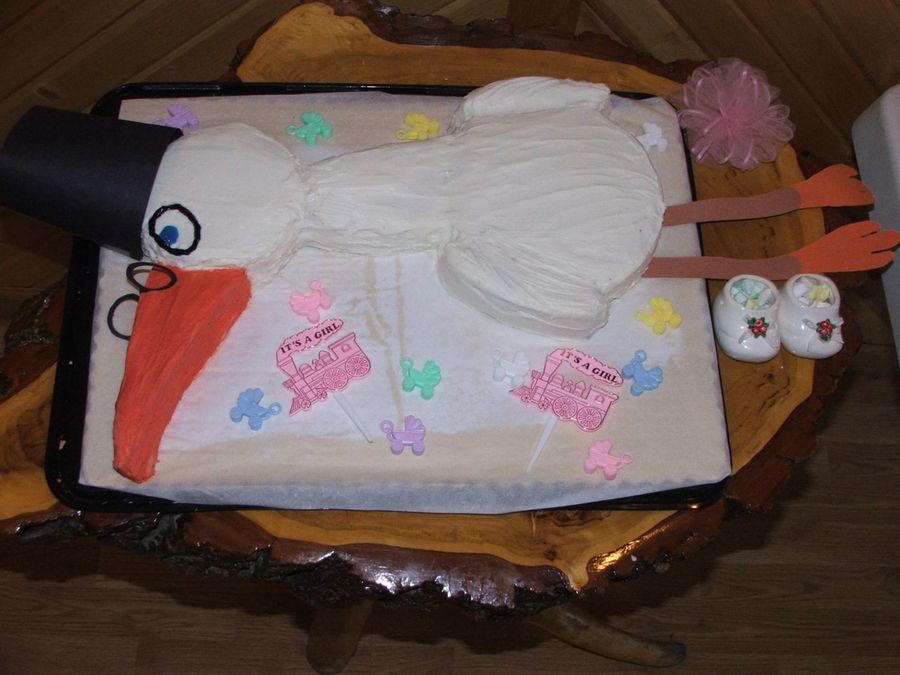 head and body made out of 2 circle (head cut smaller and trimmings used for wings) cake pans. neck and bill are made from bread pan cut diag. cut and top cut off for shorter neck. Hat, legs and glasses made from colored paper
