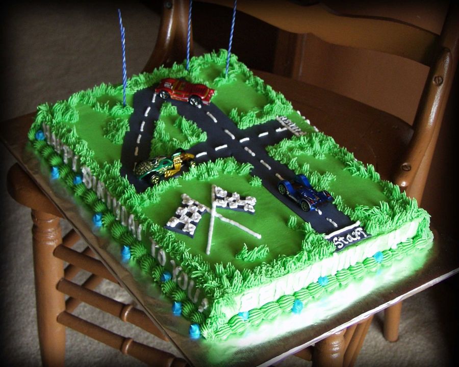 This was an original idea. JOKE!!! lololOLOL So...credit goes to the kazillion other people who've made a version of this race track cake. Whoever dreamed it up should be quite proud! It was fun, and the four year old LOVED IT! All BC except for the asphalt track...which isn't asphalt, it's fondant. :-) Matchbox cars.
