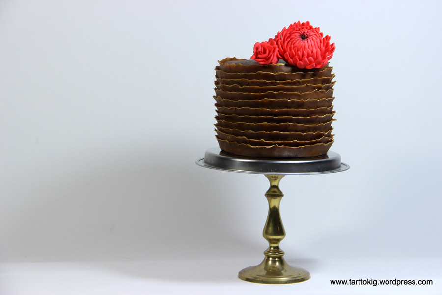 Brown and gold ruffle cake with a red chrysanhemum and small roses (tutorials for both flowers are on my blog). Such a fun cake to make!! TFL :)