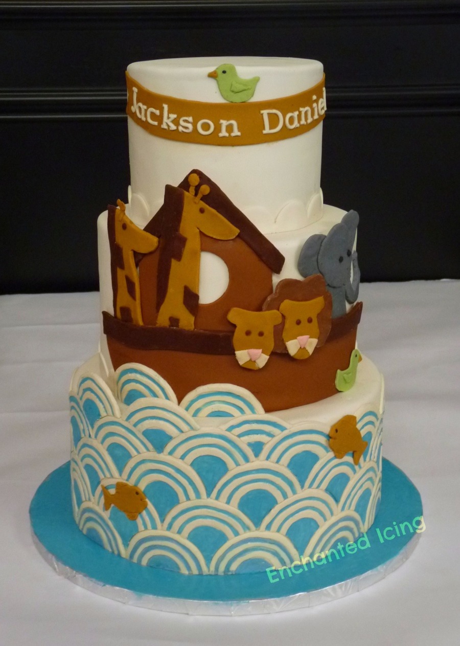 Modern take on Noah's Ark for baby Jackson's christening. The wave pattern on the bottom tier was challenging and time consuming to do.