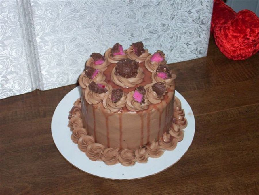 It is a 4 chocolate cake layers filled with cherry mash mousse/ganache, and iced in chocolate bc. I drizzled the non whipped ganche over the top and of course topped it with cherry mash candy! YUM!!