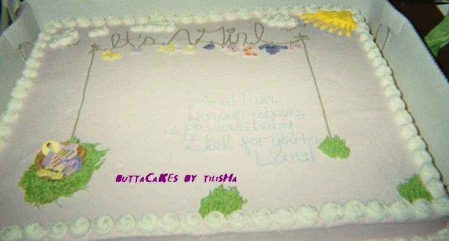 I couldn't wait to do this one. I did a full sheet cake. I wish I would have done the clothesline thicker and made the words in another color. I did my first fondant basket with clothes on the inside.