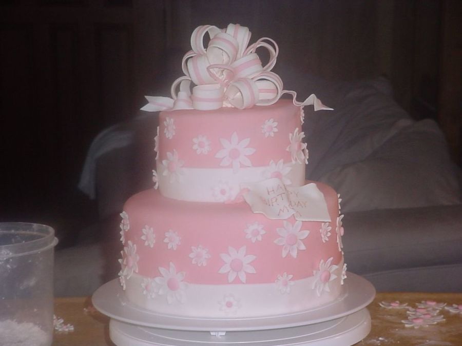For my MIL's surprise birthday party. The first cake the in-laws have got to see. It went over very well. 9in red velvet, 6in french vanilla both filled with oreo cream and covered thick in BC and then in fondant.(I always peel the fondant off before eating). 50/50 gumpaste and fondant bow and gift tag, fondant daisys.