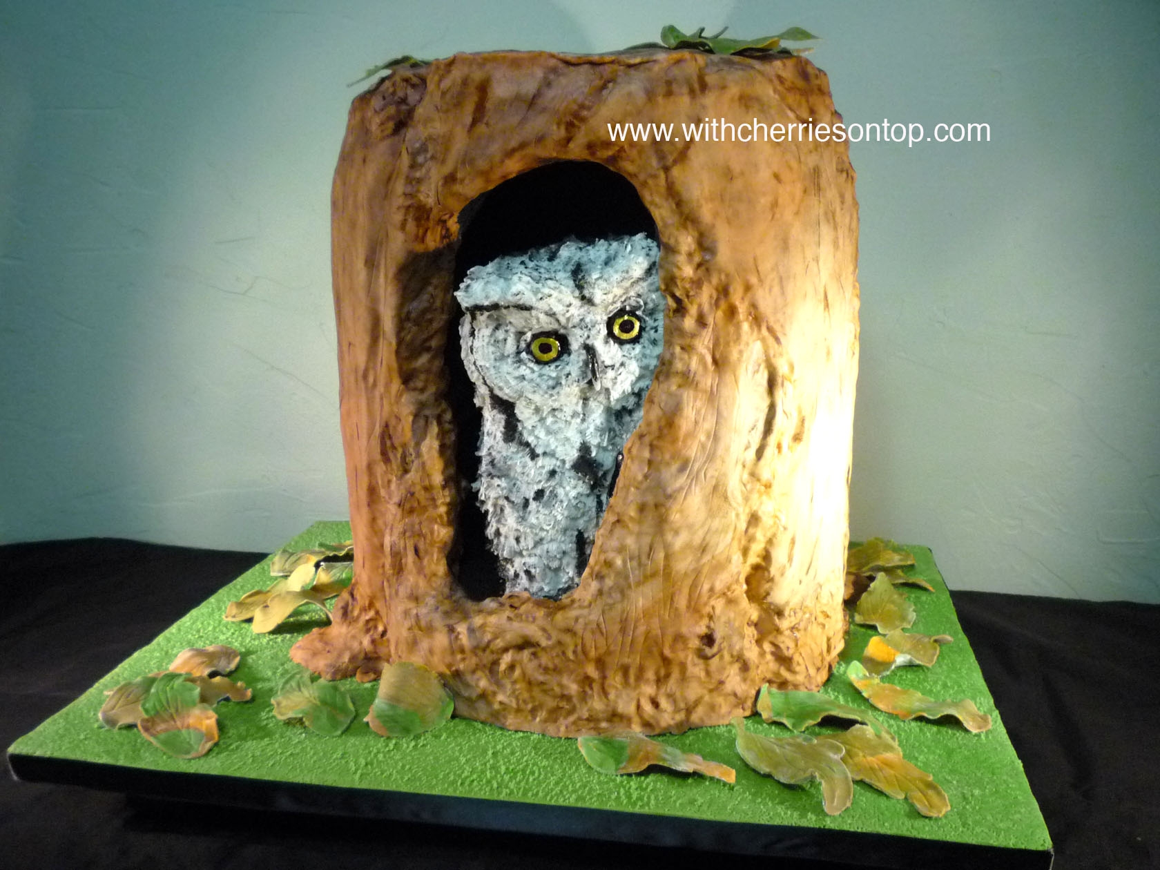 Screech owl in a tree stump. Used Fondant, Modeling chocolate and gum paste. Owl is Modeling chocolate. Won 1st place in Queen city cake and sugar art show.