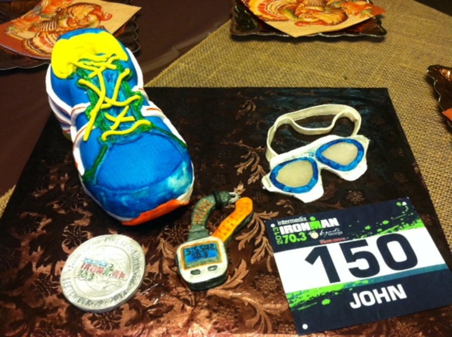 I made this piece as the centerpiece for our Thanksgiving table. It was to honor my dad for him doing the Ironman Augusta. The race bib is made from edible rice paper, the goggles, medal and Garmin are all fondant with tylose. The running shoe is the actual style shoe he wore, it is carved from rice cereal then covered with fondant. The Garmin shows the actual distance and his completion time. I was a little bummed I didn't get the bike helmet completed, but just ran out of time.