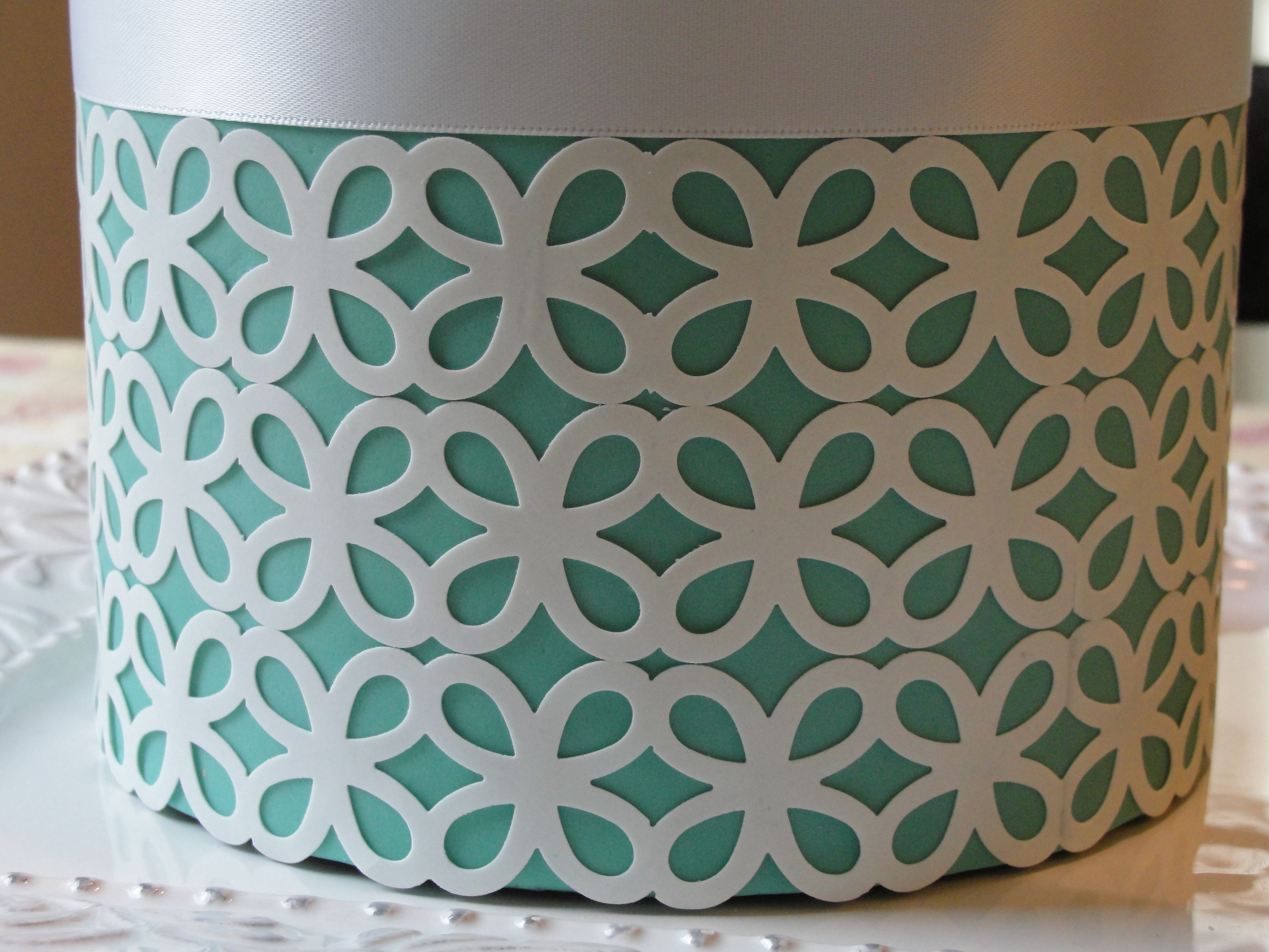 The design was made by punching edible paper with a craft punch, the ribbon is real, and the flower is gumpaste. The cake is a 6-inch cake, just under 7 inches tall. This design is inspired by Jessica Harris' second Craftsy class.