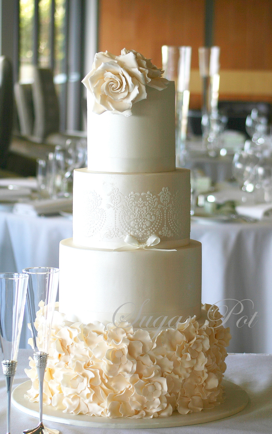 I met beautiful Sandy at the wedding expo earlier this year. Two weeks after, and we were discussing her wedding cake. She had previously seen one of my cake designs and wanted something similar and after a while we agreed on this design. She had fallen in love with one of Yummy Cakes and Cupcakes design and wanted something on similar lines. We matched the flowers to those she had in the room and her bouquet.