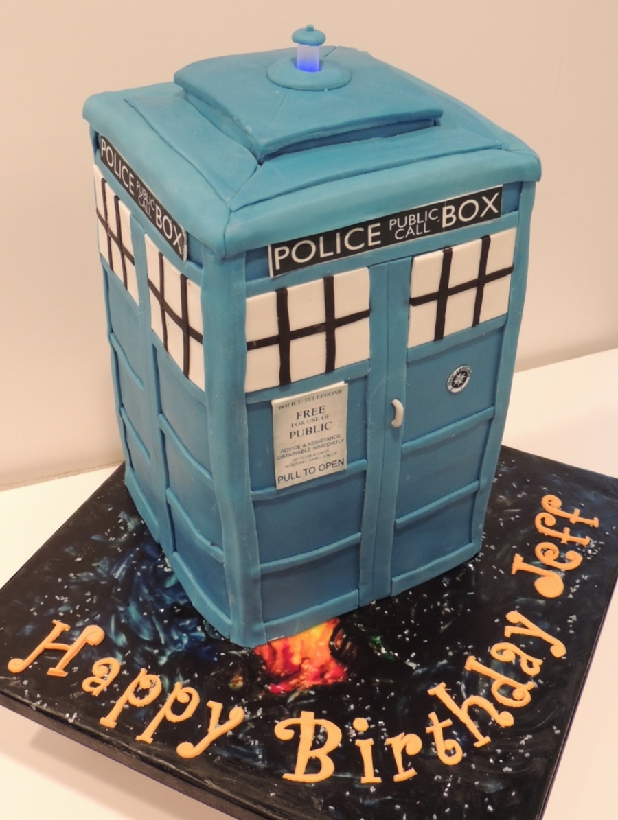 Tardis cake for my Son-in-law who is a huge Dr. Who fan. Vanilla cake with Swiss Meringue buttercream, marshmallow fondant mixed with modeling chocolate.