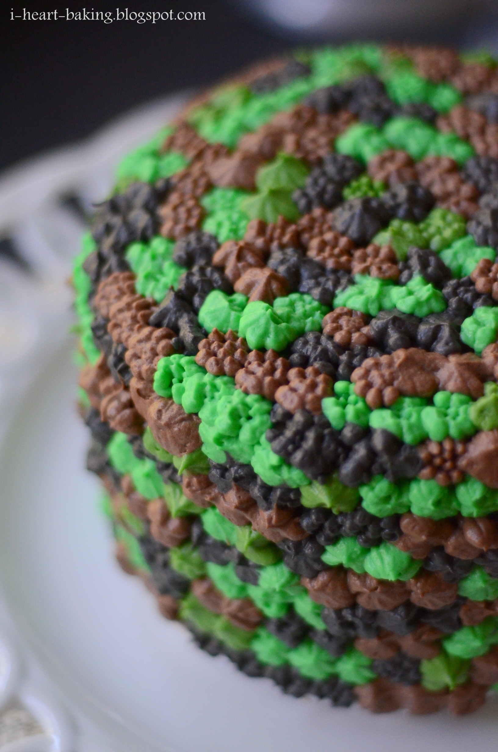 camouflage pom pom cake - chocolate and vanilla cake filled with oreo whipped cream and covered with camoflauge pom pom frosting