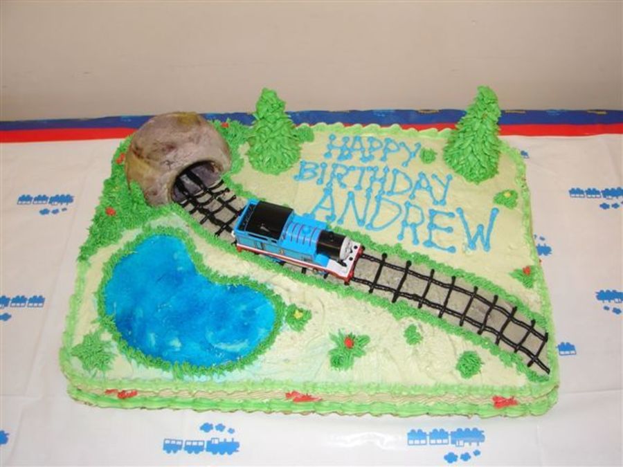 Andrew's 3rd Train Birthday Buttercream Cake, buttercream details. Tunnel made out of a muffin coated with buttercream, trees an ice cream cone, and Thomas- a toy.
