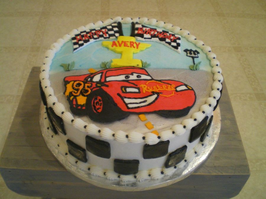 This was my son's 5th birthday cake! It was chocolate bottom layer and white top layer with cookies and cream filling. Iced in buttercream with the car being a frozen transfer. The flags are mmf. I had a great time doing this cake and he LOVED IT!!!