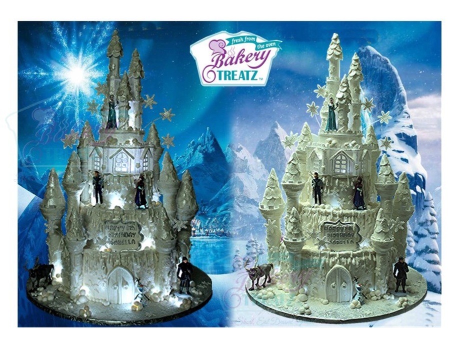 I have been doing this little girl's birthday cake every single year, and each time, she is so overwhelmed. I used lights to bring out the castle even more. All the melting snow is fondant. I used white sugar flakes on the whole cake to create a more snowy effect
