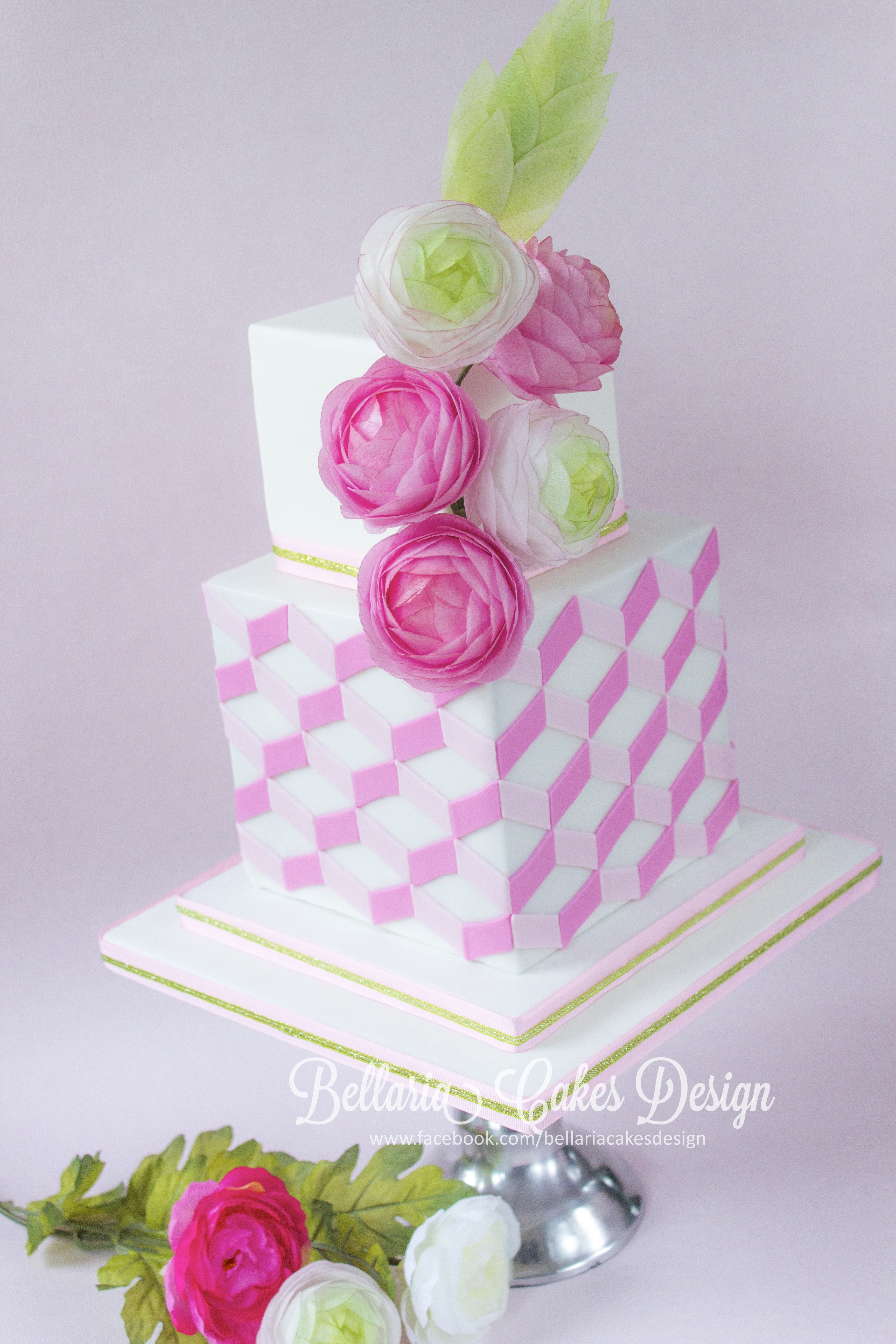 "Spring cake with wafer paper ranunculus" Spring is in the air, isn’t it ? With this cake I wanted to practice making en covering a cuboid cake and making wafer paper flowers. I used the geometrical "Escher" pattern again, this time in the colors pink and white. This cake is filled with orange cream with orange marmelade and a little bit of orange liquor Cointreau. I ate a piece of this cake and OMG … it tasted delicious !! xxx Riany