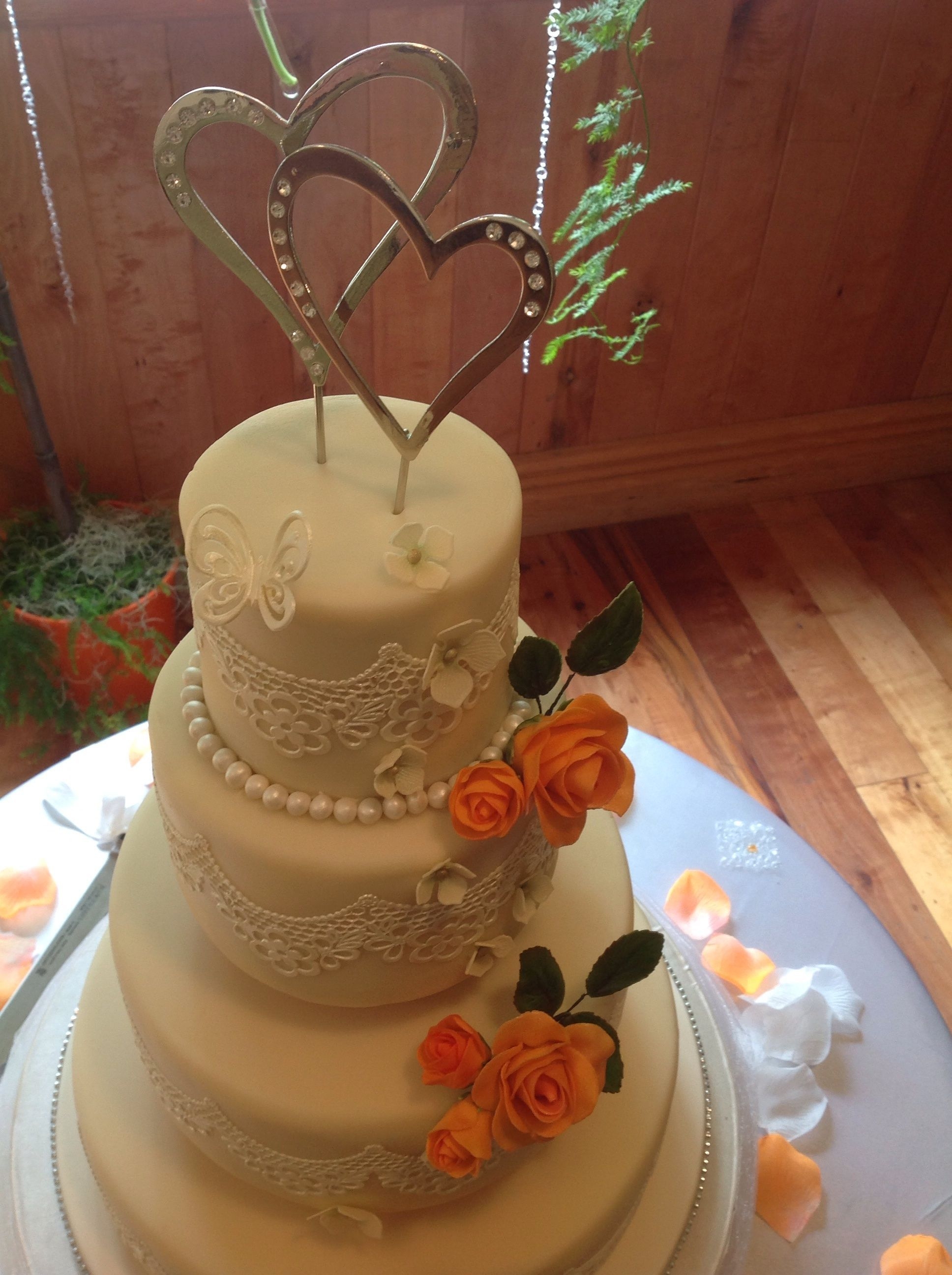 Matured fruit cake, MMF, crystal lace, gumpaste roses, hydrangeas and butterfly. Made t his wedding cake for my son and his bride. First time making a cake. Turned out very well and they were very happy.