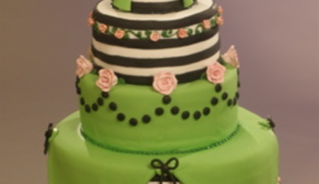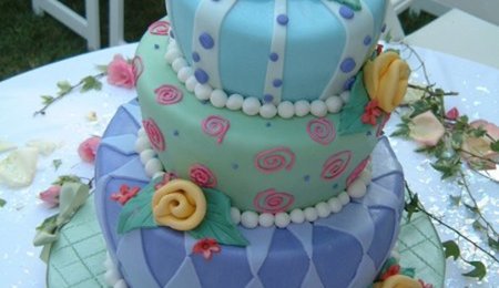 Rustic styled wedding cake featuring fresh flowers, sugar grapes, and ribbon on a 3 tiered fondant cake with inscribed details