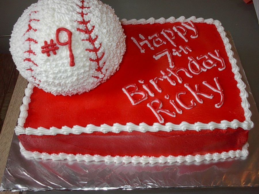 This is a cake that I threw together for my cousin's 7th birthday. He's #9 on his little league team (who's colors are red & white). My cake mix didn't rise enough in the ball pans, so my ball looks smooshed. Oh well, he loved it! That's all that matters.