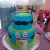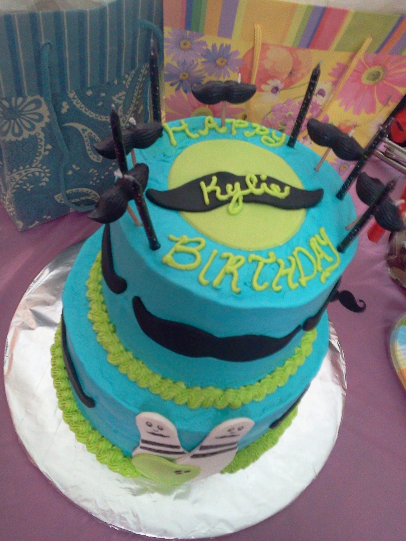 Butter cake with cream cheese buttercream. Bowling pins & bowling ball are gumpaste, mustaches are fondant. The mustaches sticking out of the top of the cake are candles. My first (almost) all buttercream cake in a long long time, used Melvira's method for smoothing.