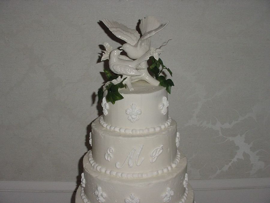 Close-up of the USNA wedding cake showing the royal icing monogram and the very pretty Lenox ornament.