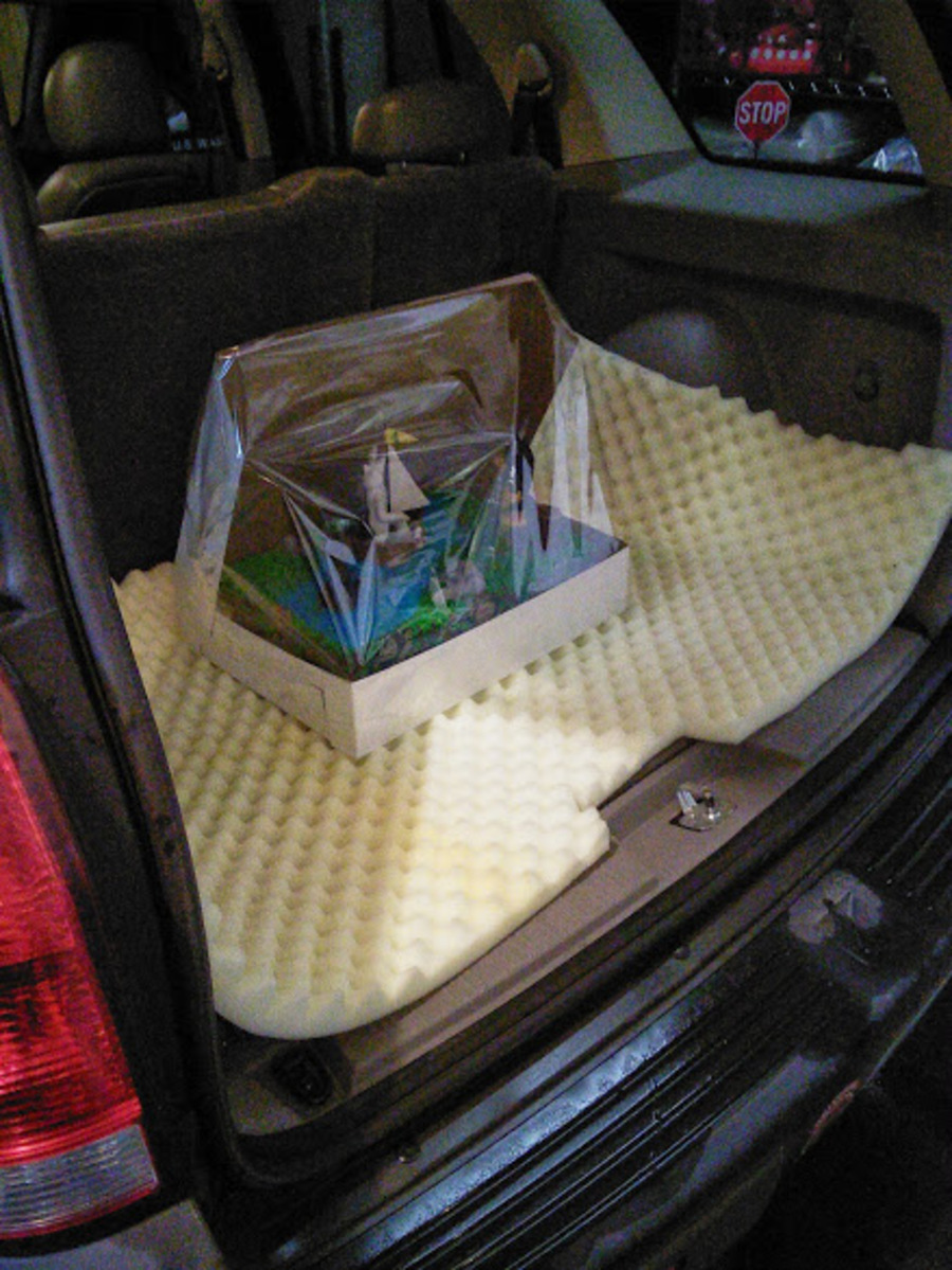 I came upon this little trick by complete coincident that I had an egg crate mattress bundle in my garage that I had bought for cake decorating. Since I had extra, I now use it for cake transporting. No more having my husband drive me to deliver one cake that has fragile pieces. I just put this egg crate mat in the back of my car and once I sit the cake on it...it stays! No sliding and the cushioning probably (I don't know I'm not back there) helps with the lumps and bumps you hit on the way to your destination. Once the cake sits on the crate it's like Velcro!