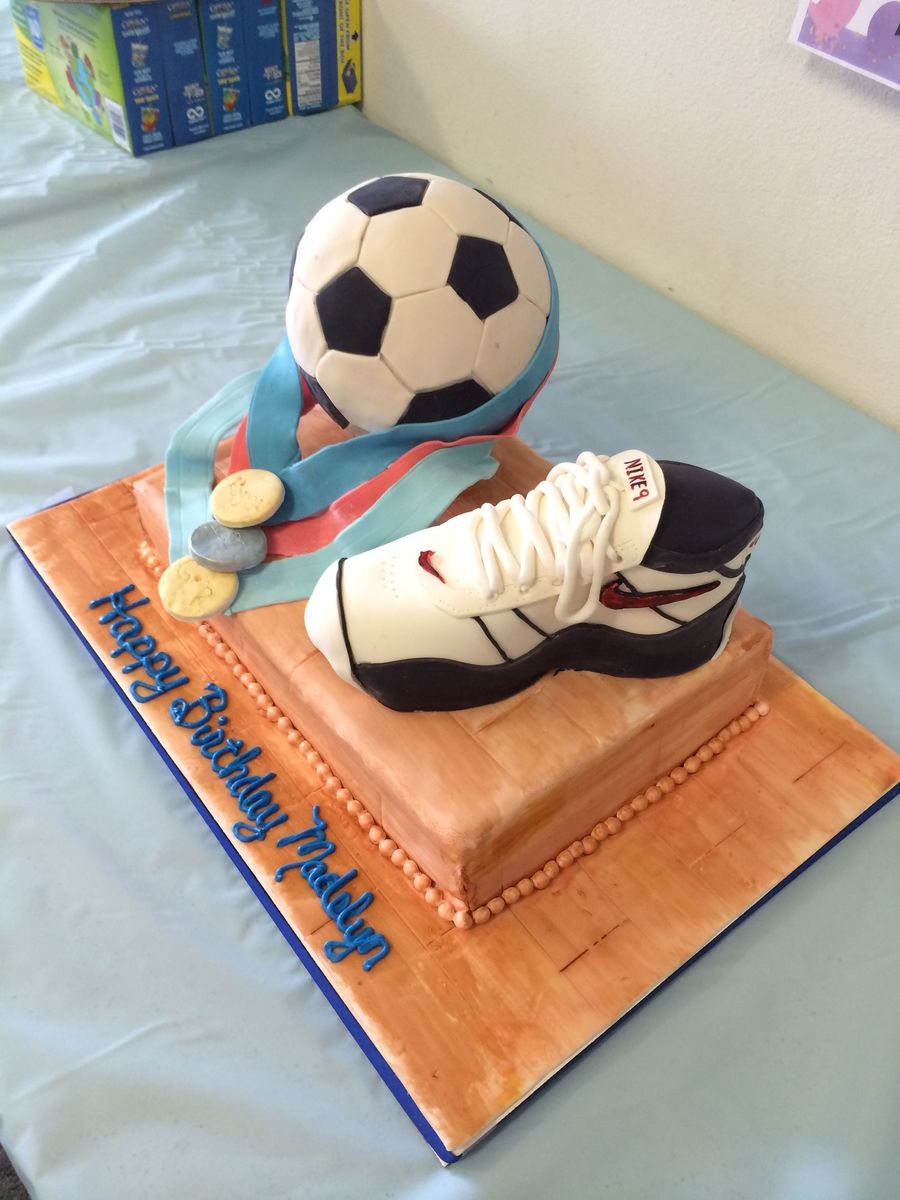 I only make about three cakes per year. This was for my daughter who wanted a soccer ball and something to represent basketball and her running. I'd do many things differently next time (a different color for the cake board, smaller ribbons on the medals) but she was happy. The kids at the party thought it was gross that we put her own (worn) shoe was on the cake, which was a wonderful thing to hear them say.