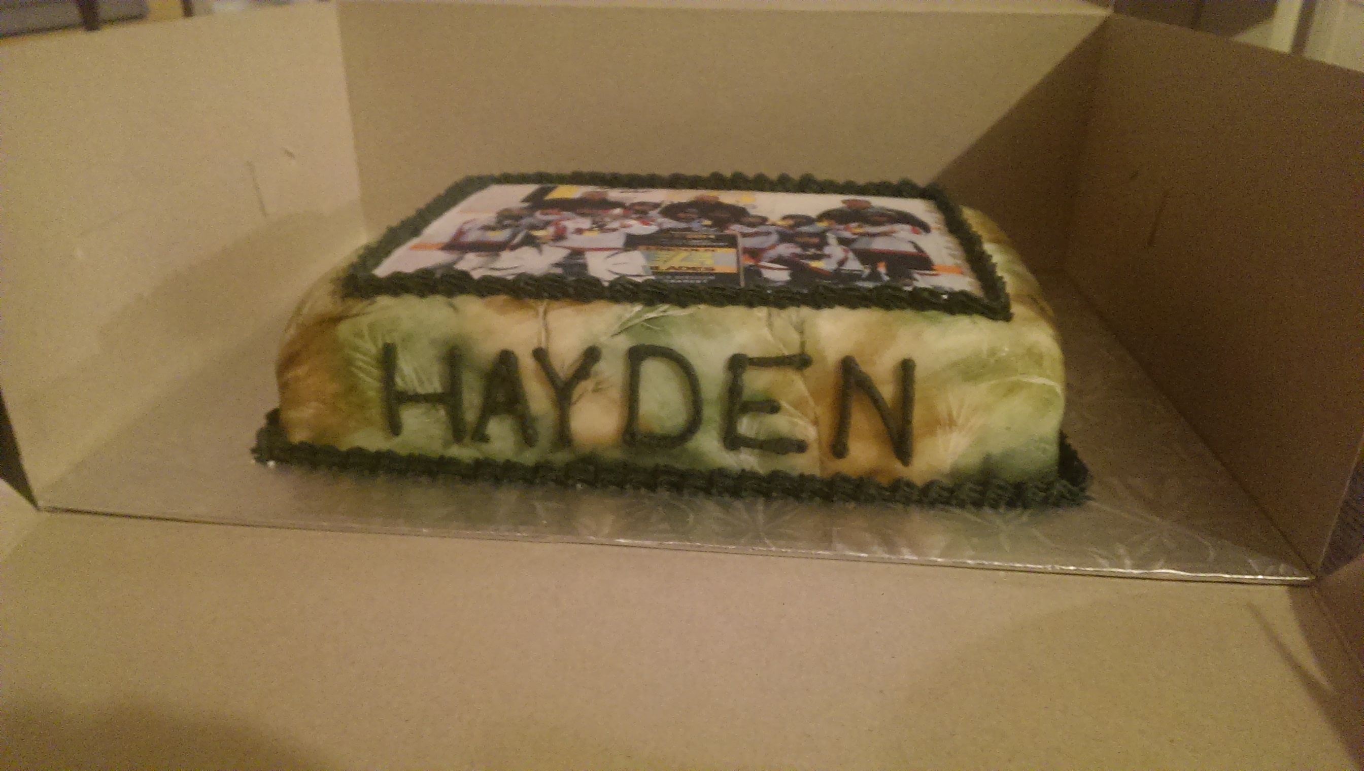 6 layers of chocolate cake, and buttercream icing. Modeling chocolate overalls, mouth and glasses strap. Red beverage cups for sirens. Really fun!