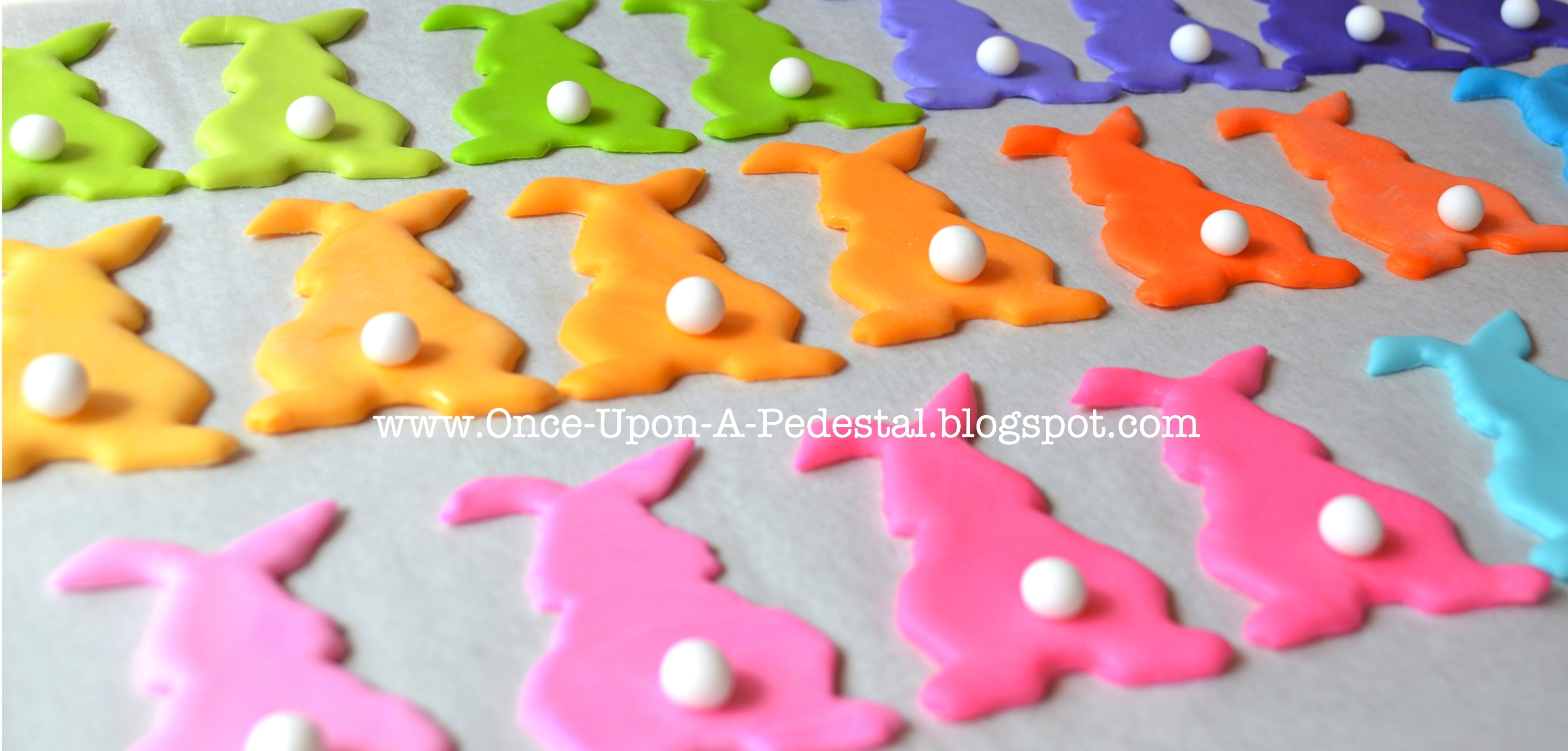 Hidden Bunnies inside a twice baked cake. Fondant bunnies to match on the exterior. Fondant lettering on top. Blue and green bunnies shown here.