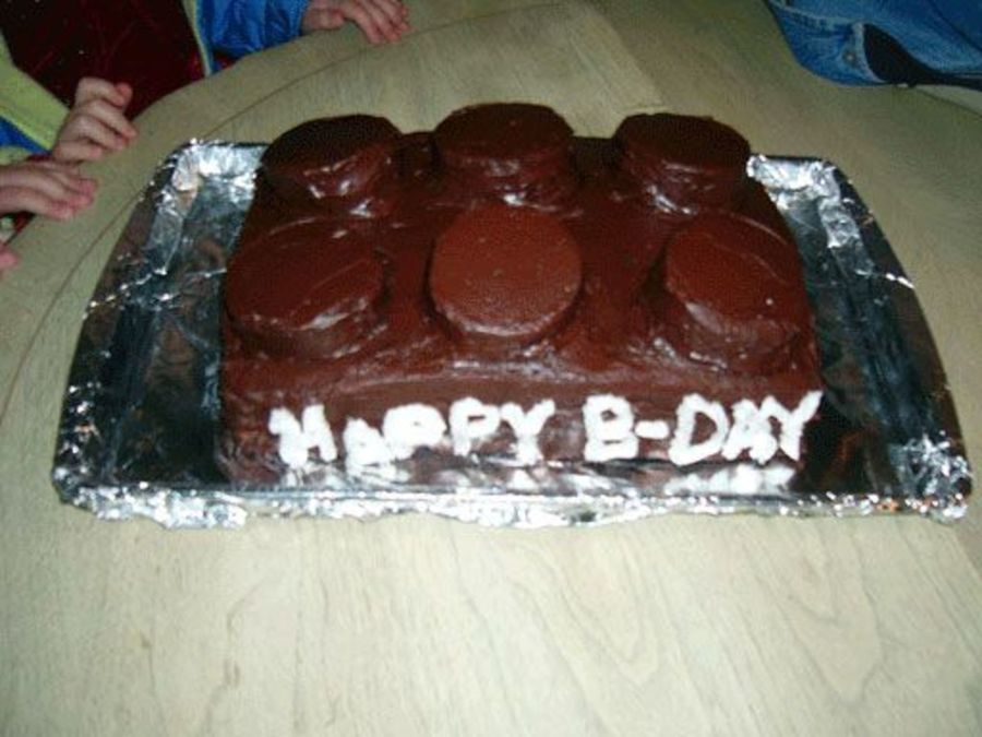 Done with a 9x13 pan, made 3 layers, used two for the base of the lego adn used a 2 1/2 inch Biscuit cutter for the lego connectors on top! Also thought about useing Dingdongs. Just made it a chocolatelego, Nephew requested a Chocolate cake with chocolate and more chocolate!