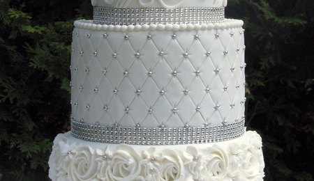 3 Tier All White Wedding Cake Decorated With Buttercream Rosettes Quilting And Scrolling And Accented With Silver Pearls And Glam Ribbon