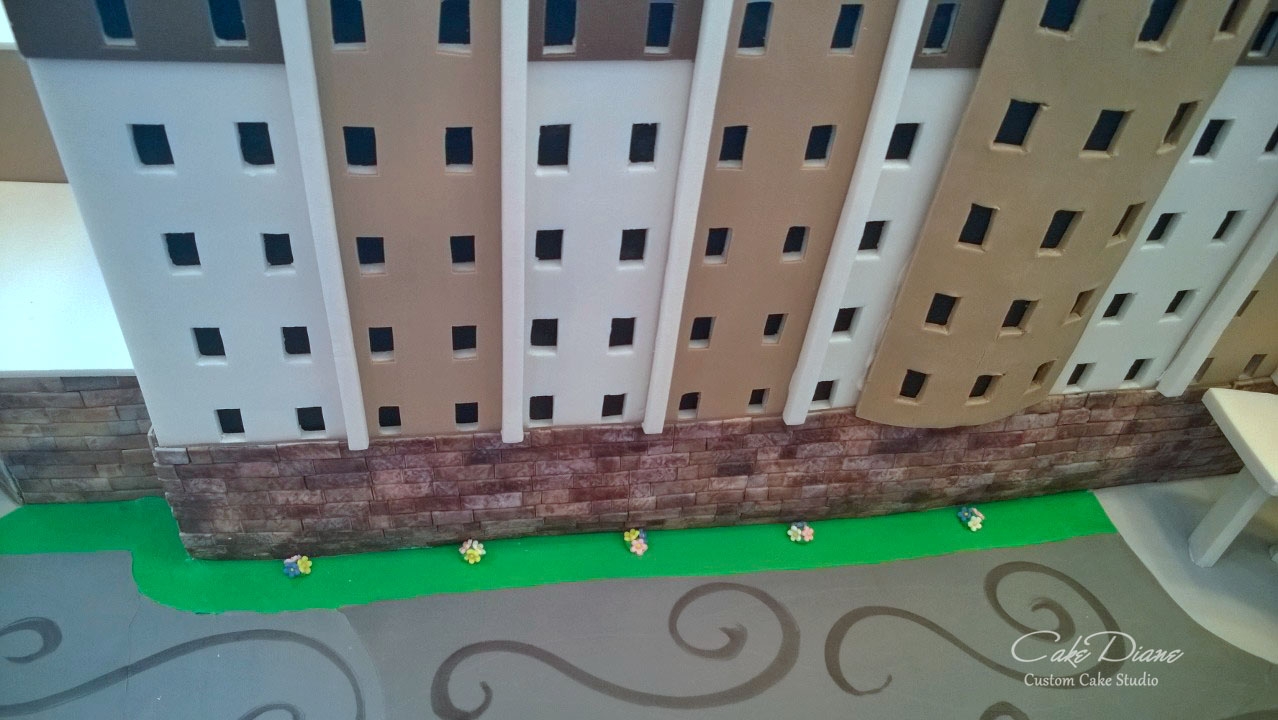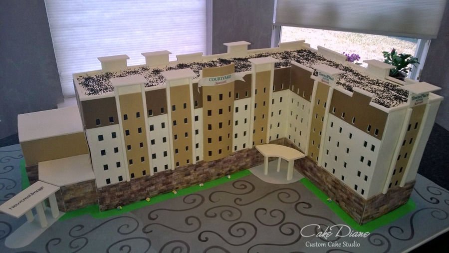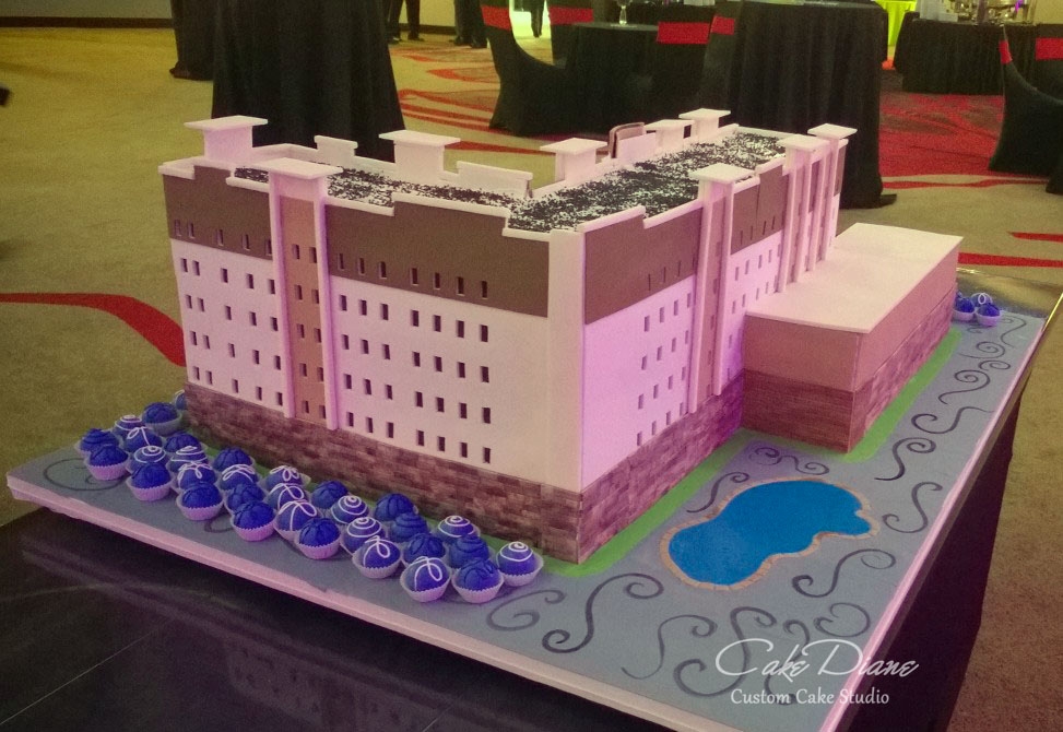Replica of a hotel for their Grand Opening celebration, along with 200 cake balls. The cake was about 2 feet long, a foot high and served 200. Well, it WOULD have served 200 if they had cut it before most of the guests left! All cake, fondant, gumpaste and chocolate.