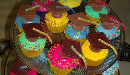 Client requested a 2 tiered graduation cake with stripes, polka dots & a BIG bow. School colors were red, black and white. Thanks for looking!