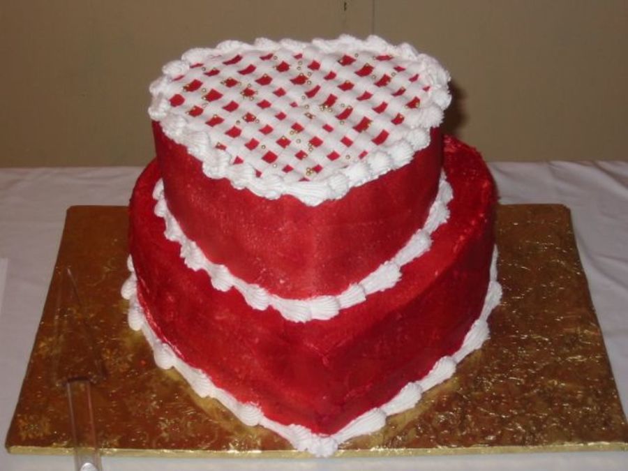 This cake was iced with buttercream then airbrushed red. A lattice top and and shell border finished it off.